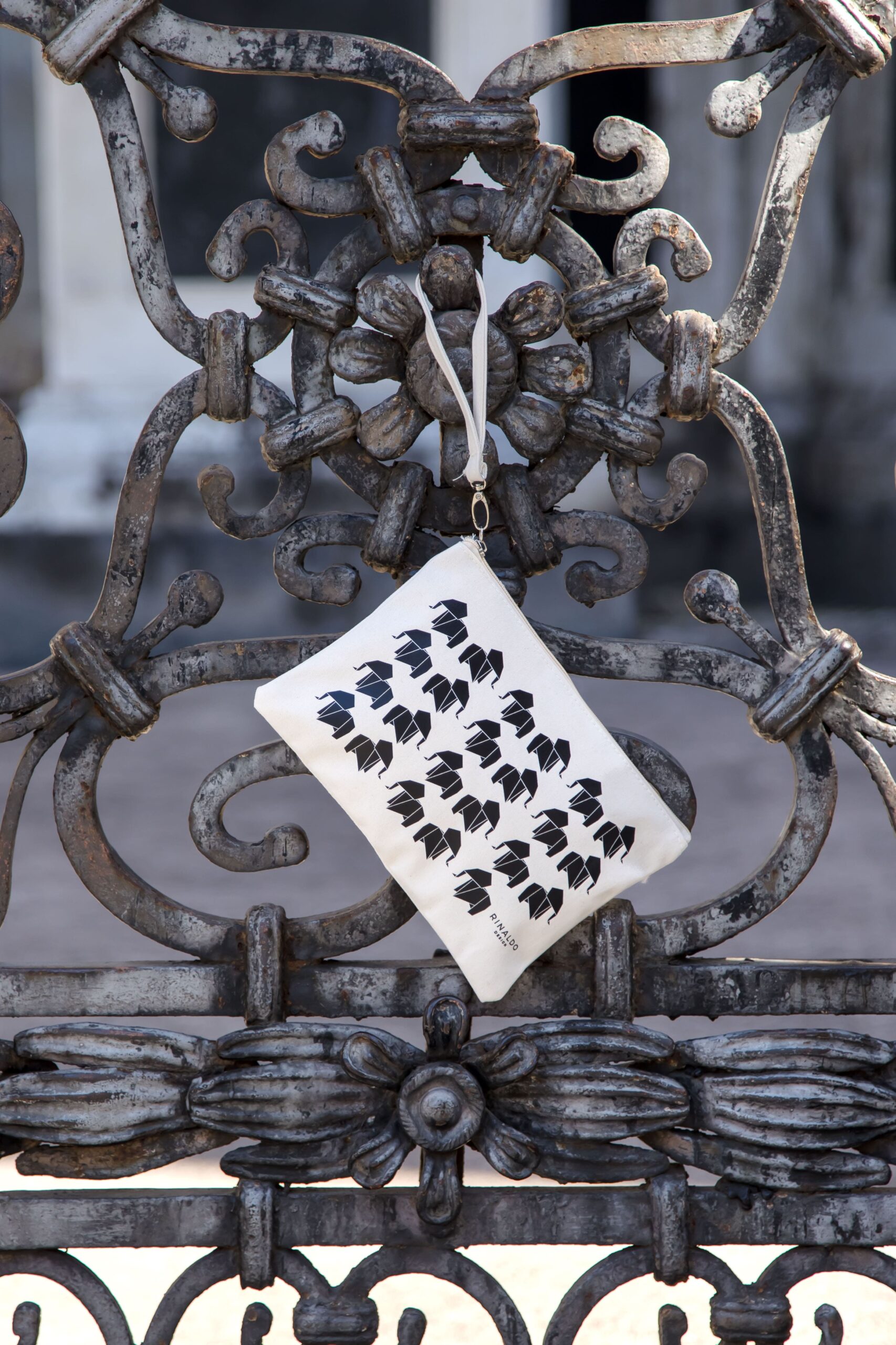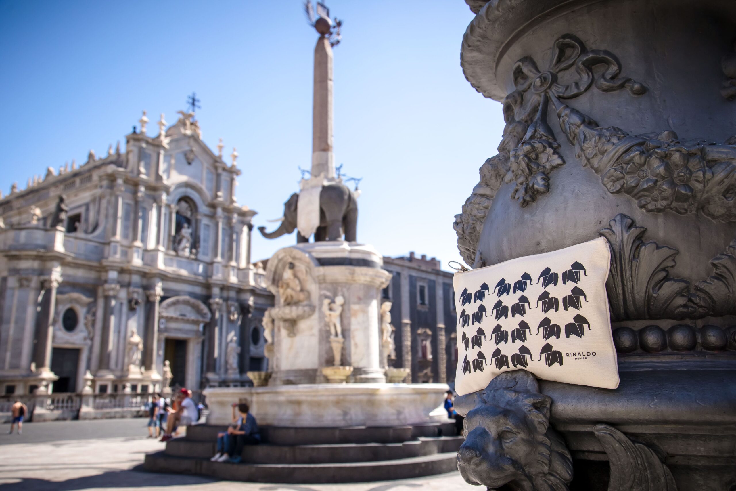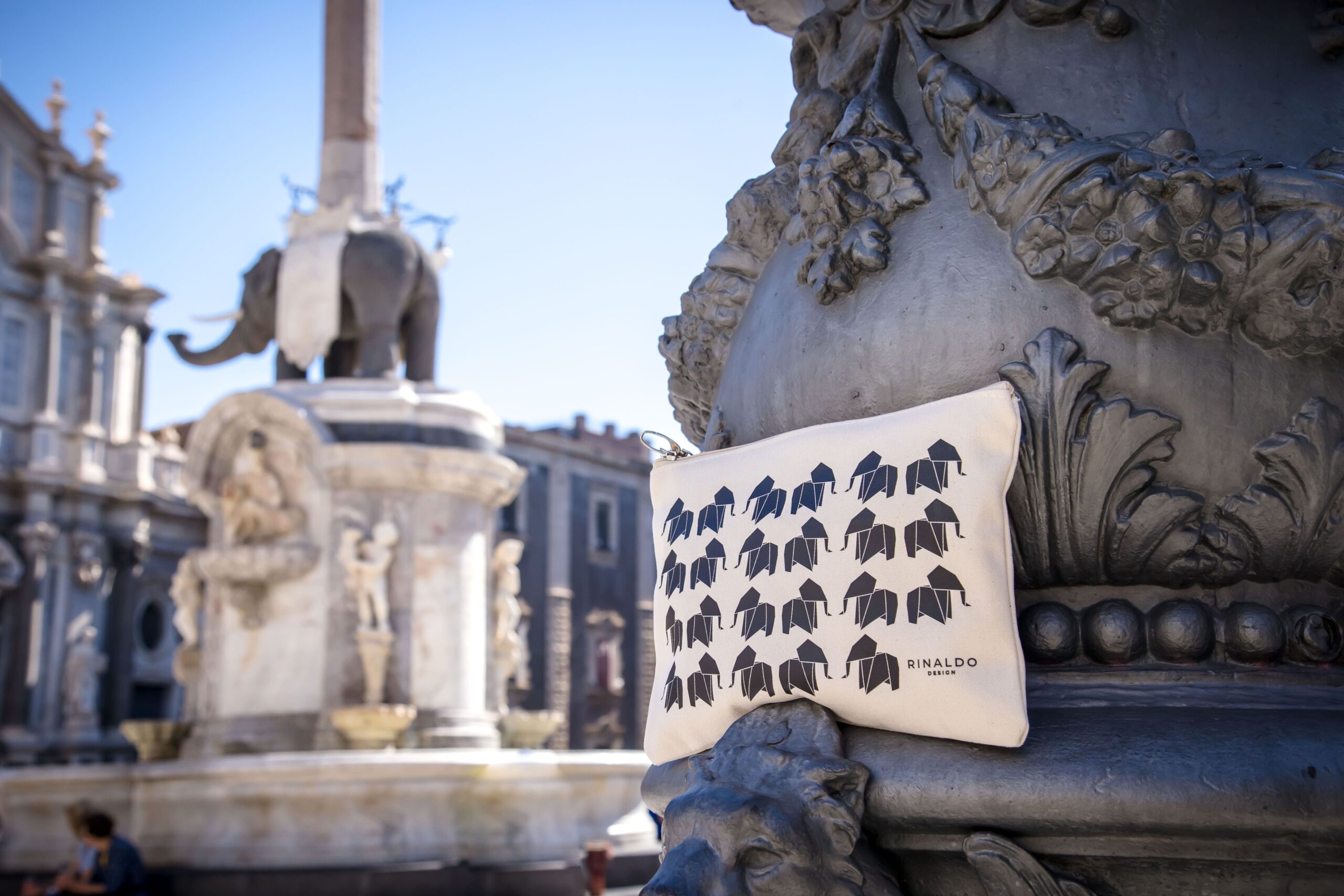 Pochette con cinturino da polso dedicata a “u Liotru” – l’elefante di Catania – la fontana in pietra lavica, simbolo di forza e identità della città.